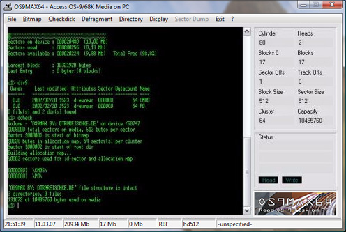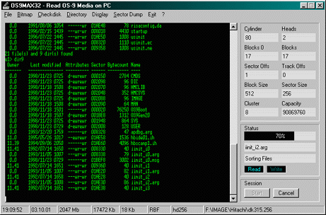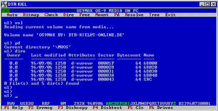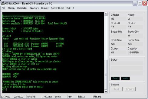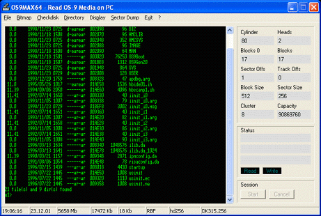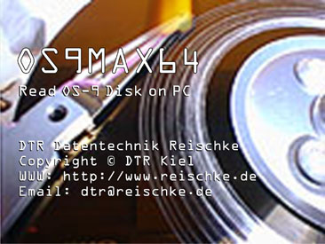 OS9MAX allows to access OS-9 formatted disks on DOS or Windows PCs. OS9MAX reads, writes, and formats OS-9 disks on PC. All OS-9 file and directory manipulating commands are implemented.
