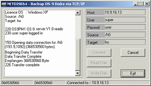 The OS-9 disk '/h0' has been transferred via network to the PC. The file 'd:\image\os9disk\h0.img' has been created on the PC hard disk with 160 MB. This is exactly the size of the OS-9 disk. Before you wish to save this backup to CD-ROM you may collect other OS-9 media on the PC hard disk, or revise the backup files with OS9MAXIM. This software allows to access the backup files as if they were physical OS-9 media. OS9MAXIM allows to transfer/copy OS-9 files and directories from the backup to the PC hard disk and vice versa.